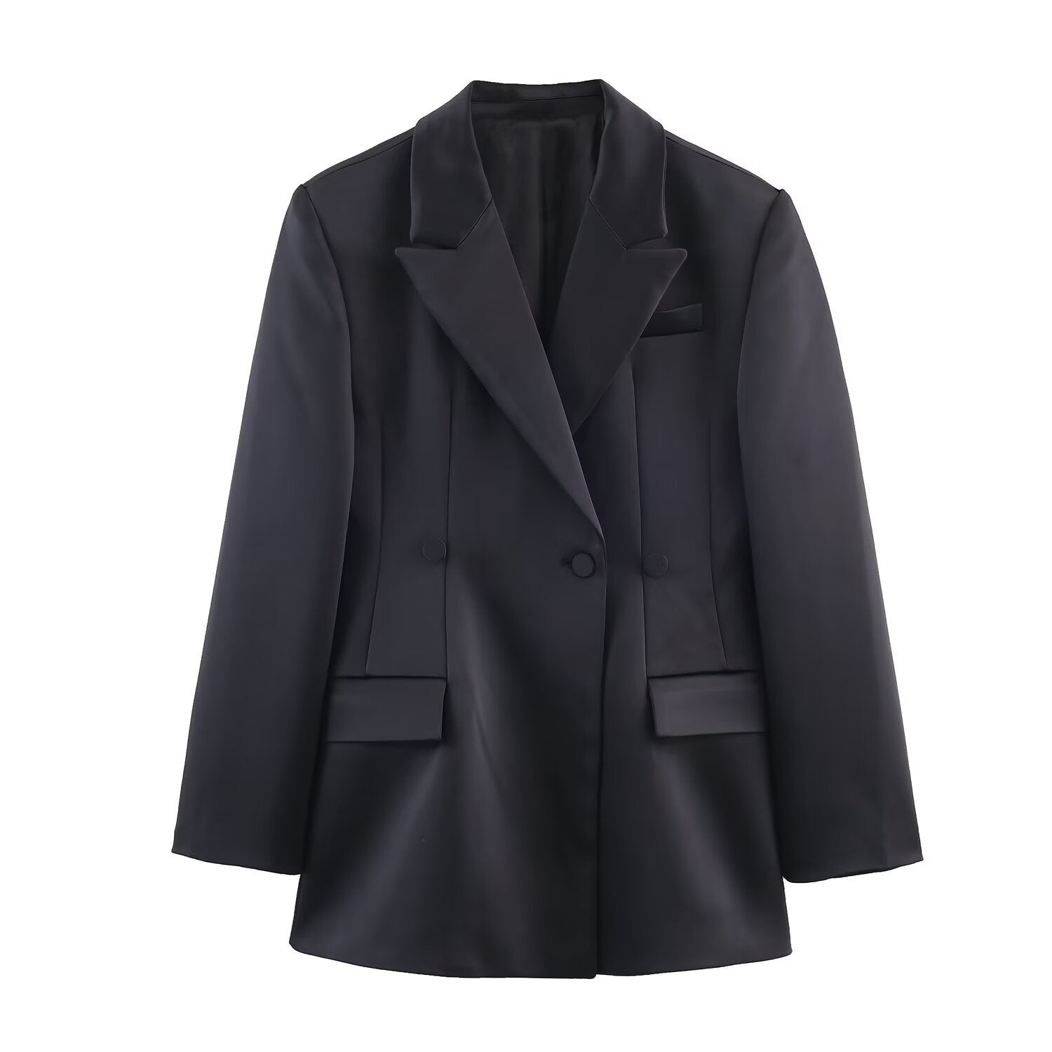 Meet the MeandMio Essential Oversized Single-Button Satin Blazer - Black.