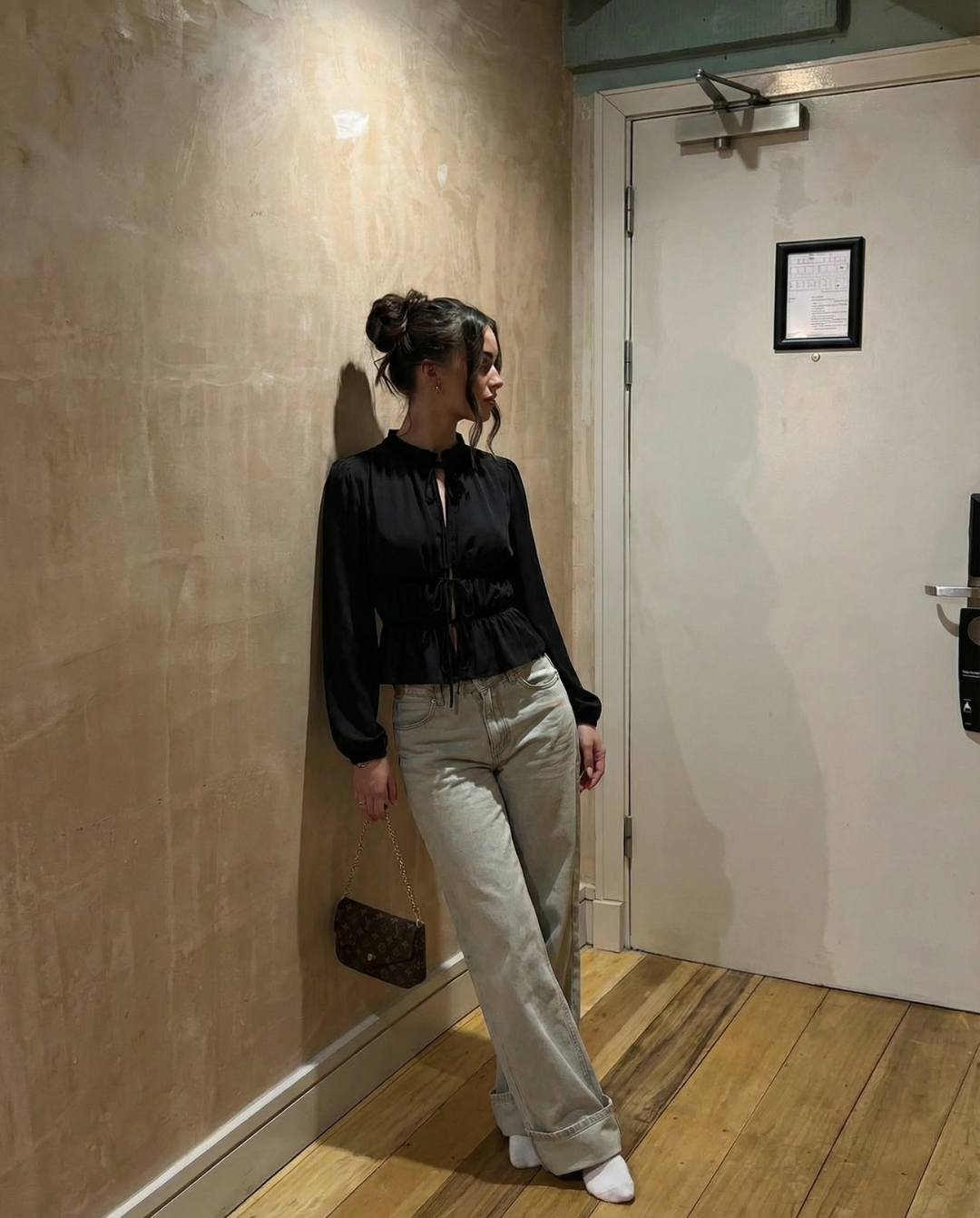- Ruffled high neckline – Adds a romantic, elevated touch without feeling overdone