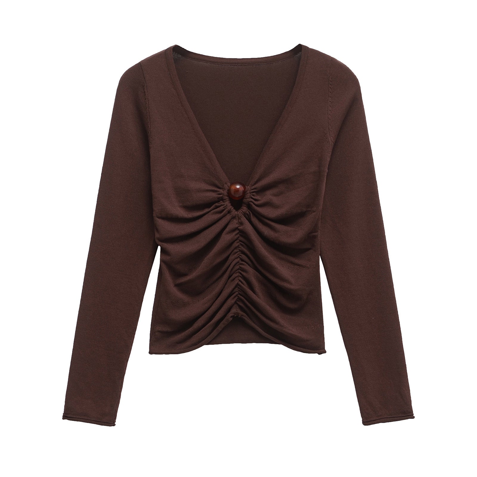 Fawn | Ruched Long Sleeve Top Brown V Neck