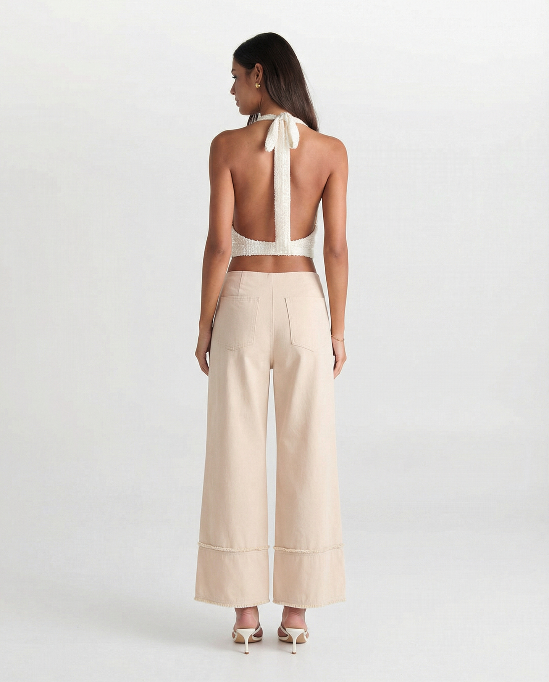Vera | Wide Leg Cropped Pants Cream High Waisted Raw Hem