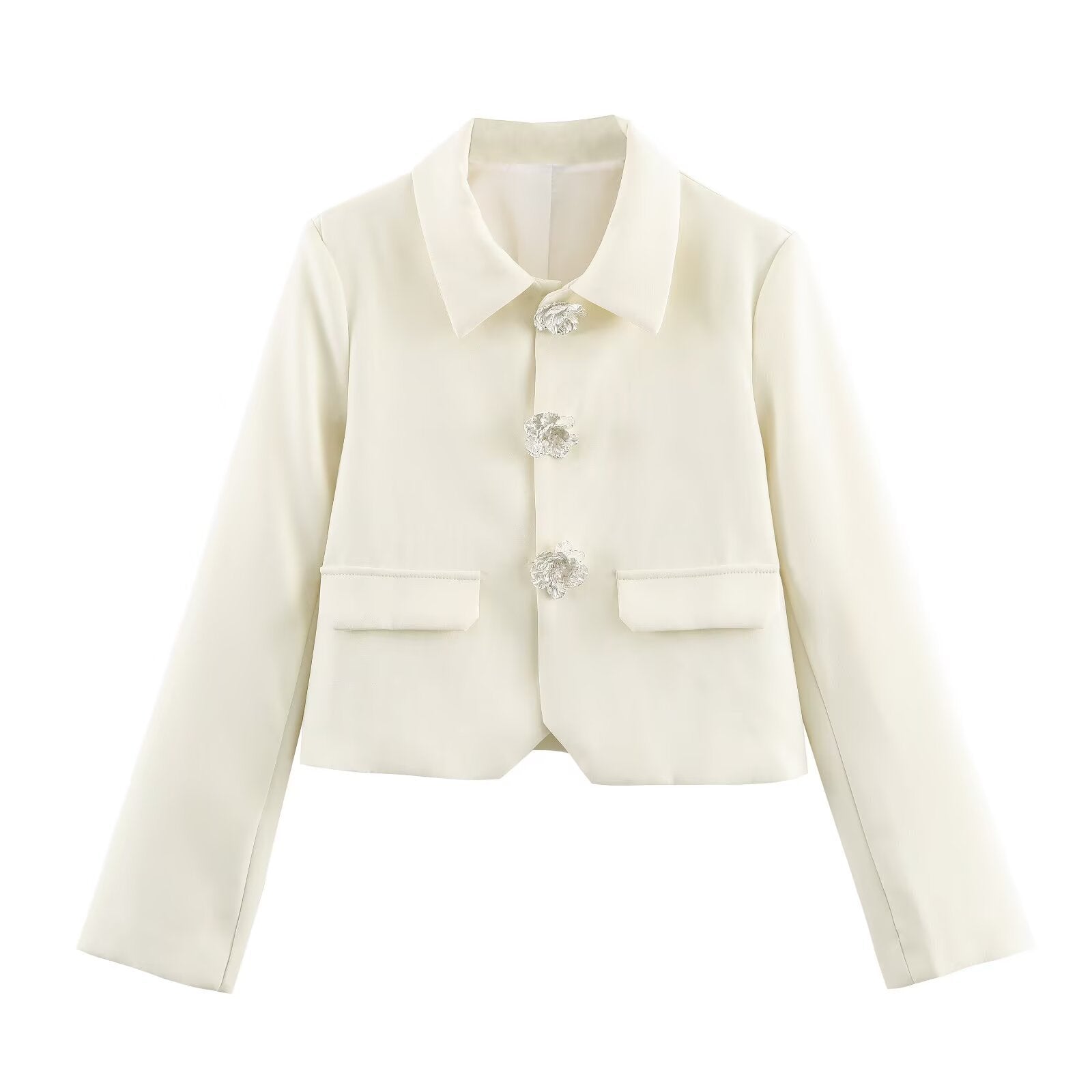 The floral buttons bring subtle romance with a refined finish.