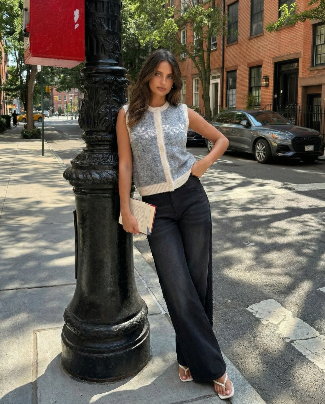 Greta | Sleeveless Cable Knit Cardigan Gray Cream Button Front