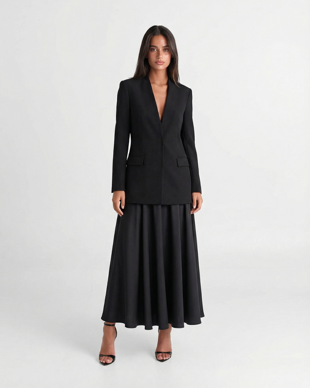 - Blazer-inspired bodice - Strong, tailored, and flattering