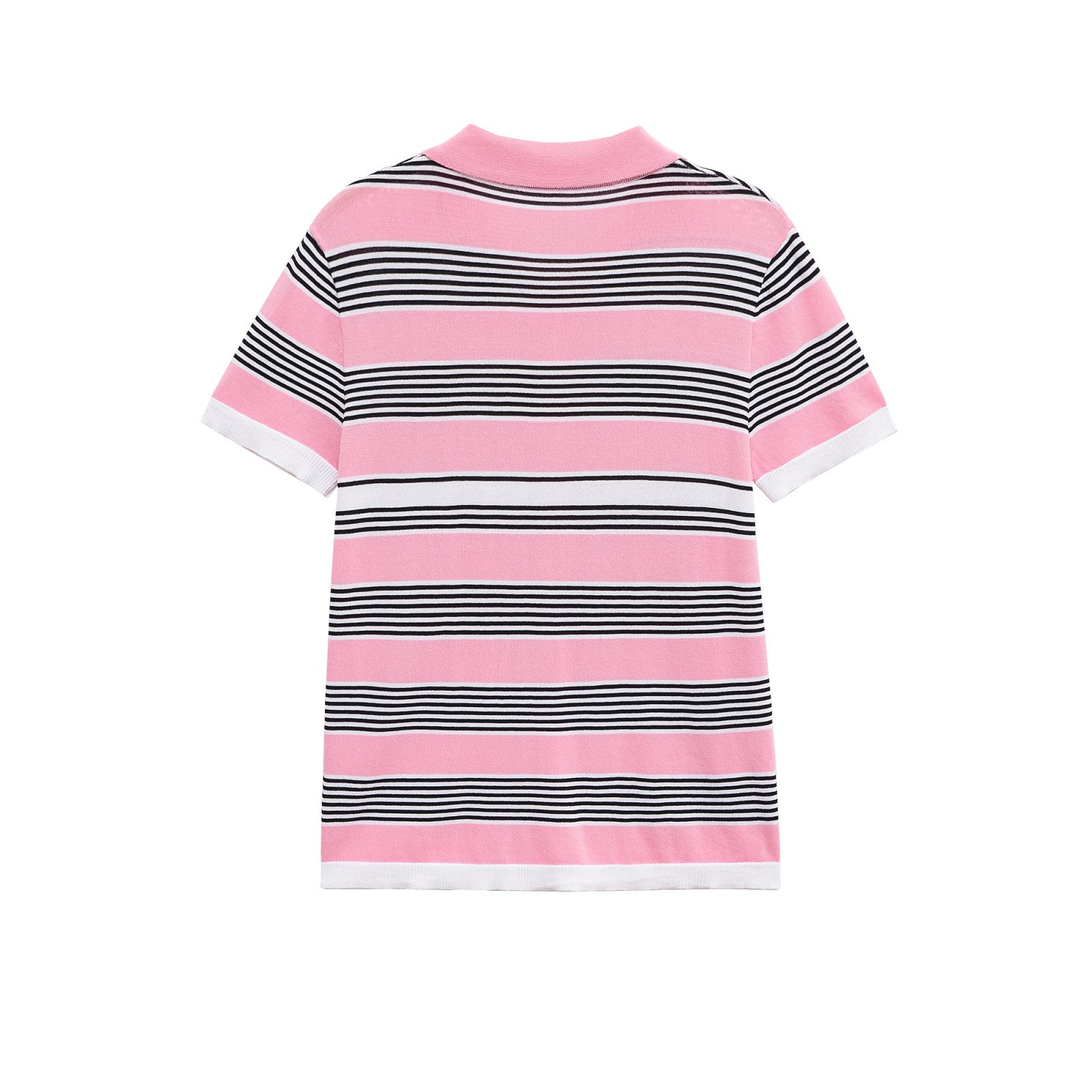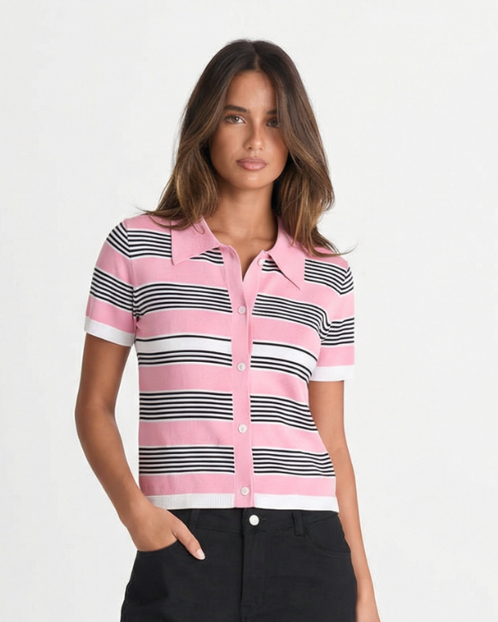 Meet the MeandMio Daisy | Chic Striped Knit Short Sleeve Polo Top.