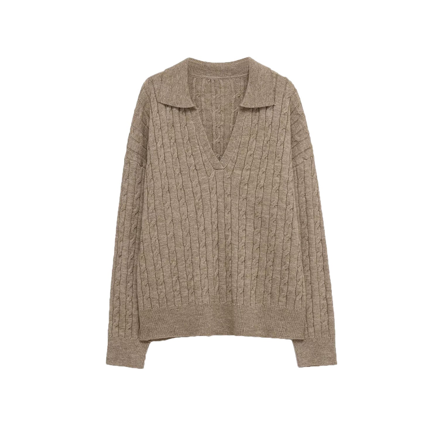 Eleanor | Brown Cosy Cable Knit V-Neck Polo Jumper