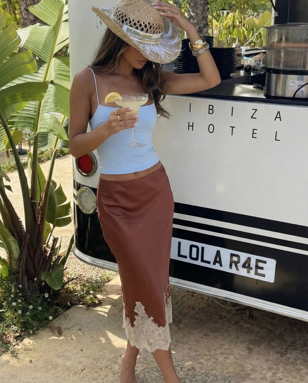 Introducing the MeandMio Luxe Lace Trim Midi Skirt - Brown.