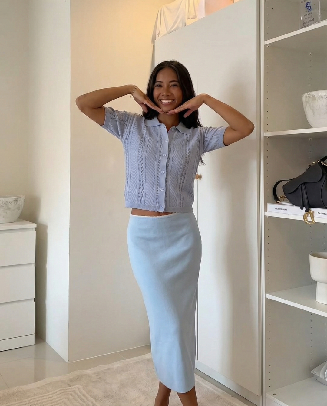 The clean button-front and soft collar frame your look beautifully.