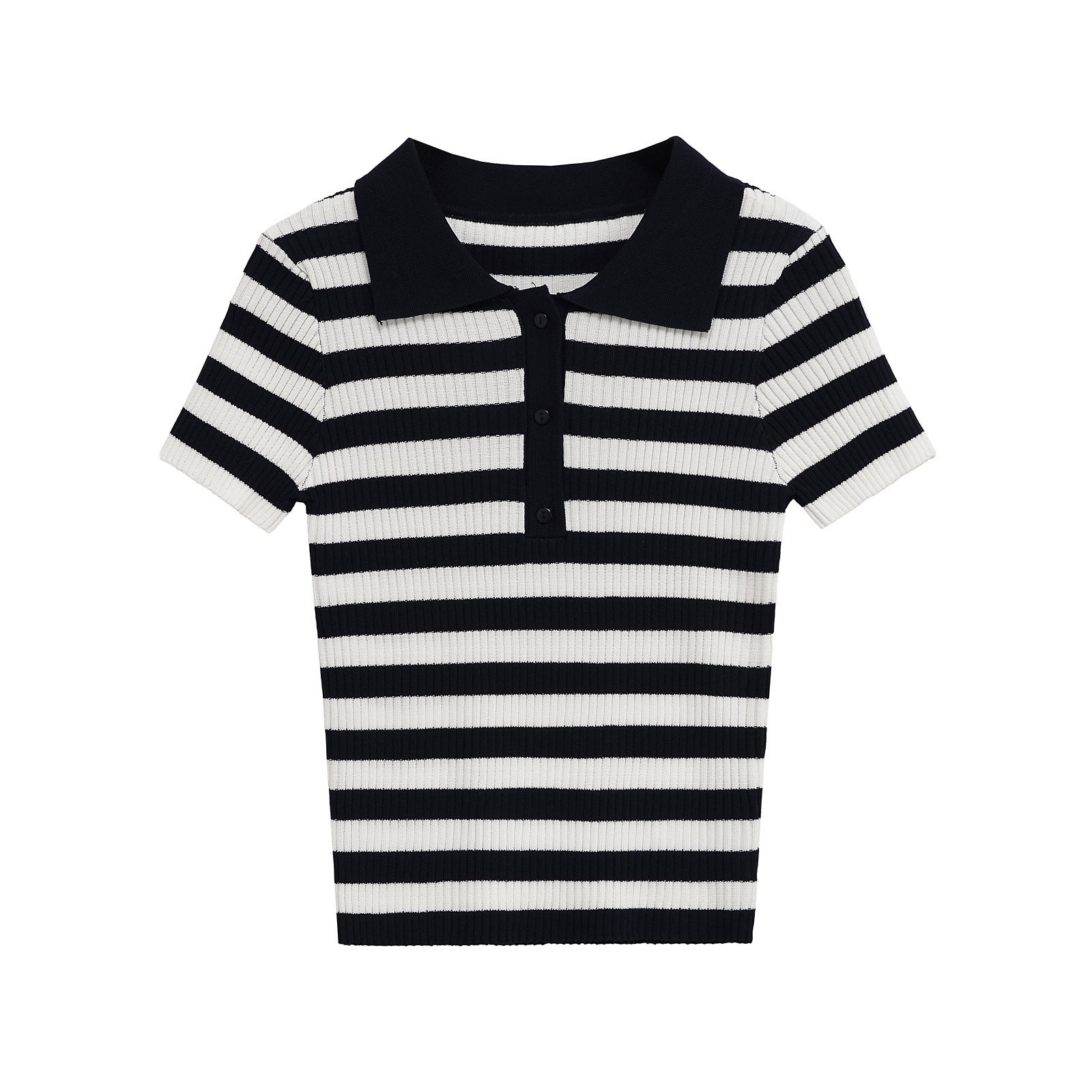 Meet the MeandMio Harper | Chic Ribbed Knit Striped Polo Shirt.