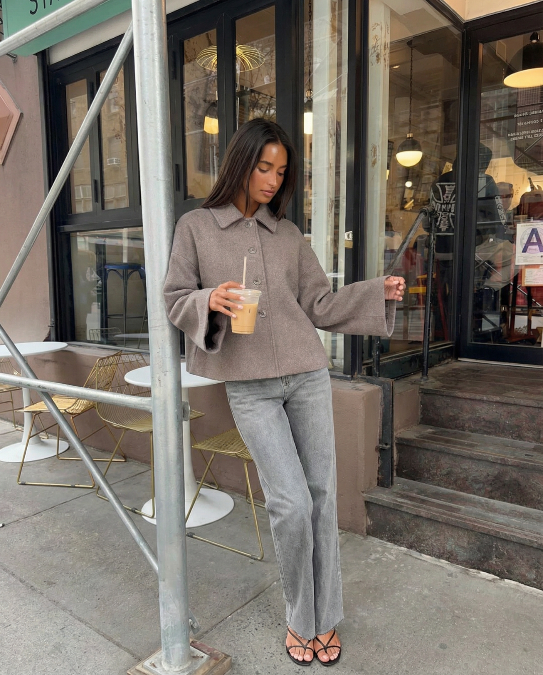 Until now. Meet the MeandMio Essential Wide-Sleeve Cropped Jacket – Taupe.