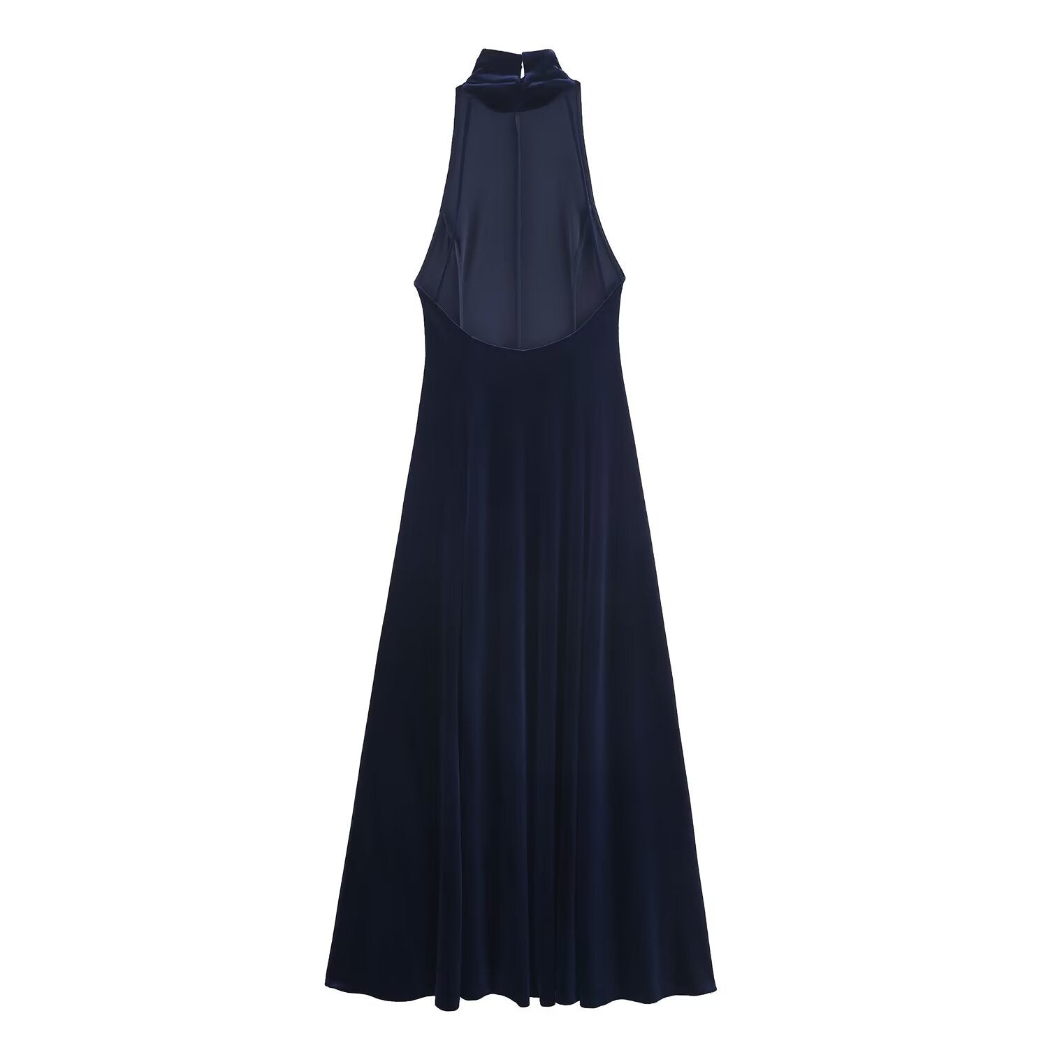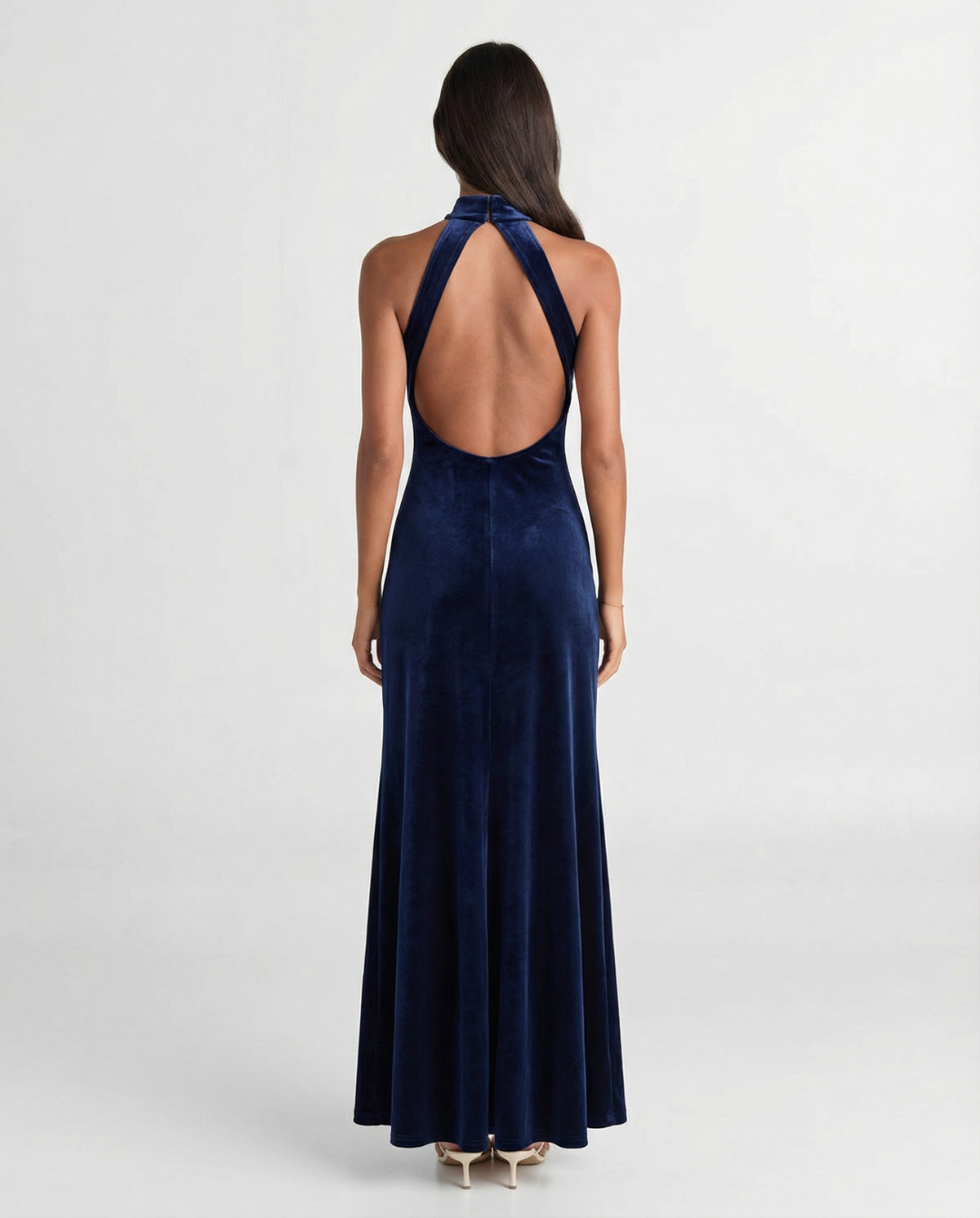 Meet the MeandMio Luxe Fluid Halter Dress - Dark Blue.