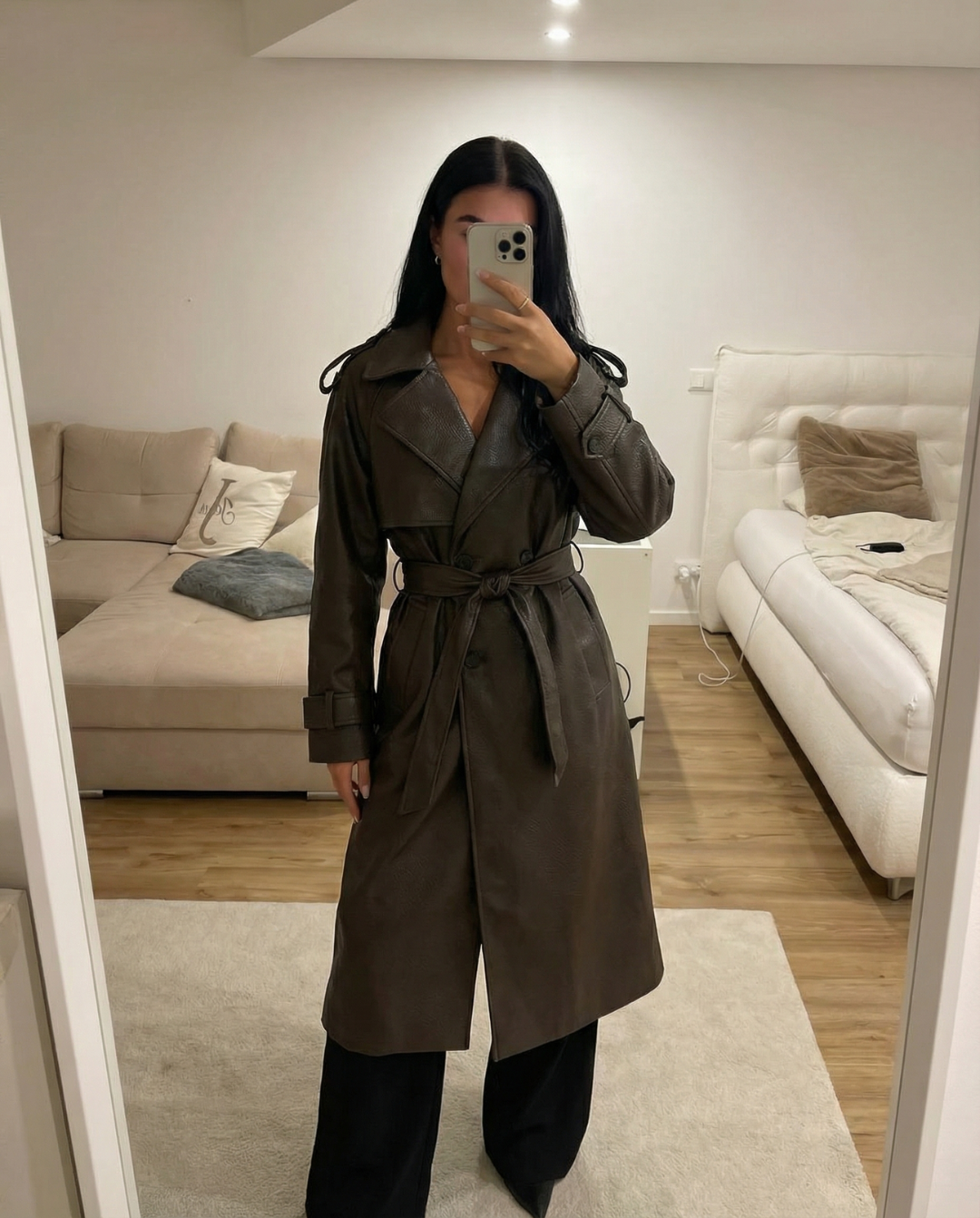 Until now. Meet the Meandmio Luxe Belted Leather Trench Coat – Black. A statement piece designed to elevate your look while keeping things effortless and wearable.