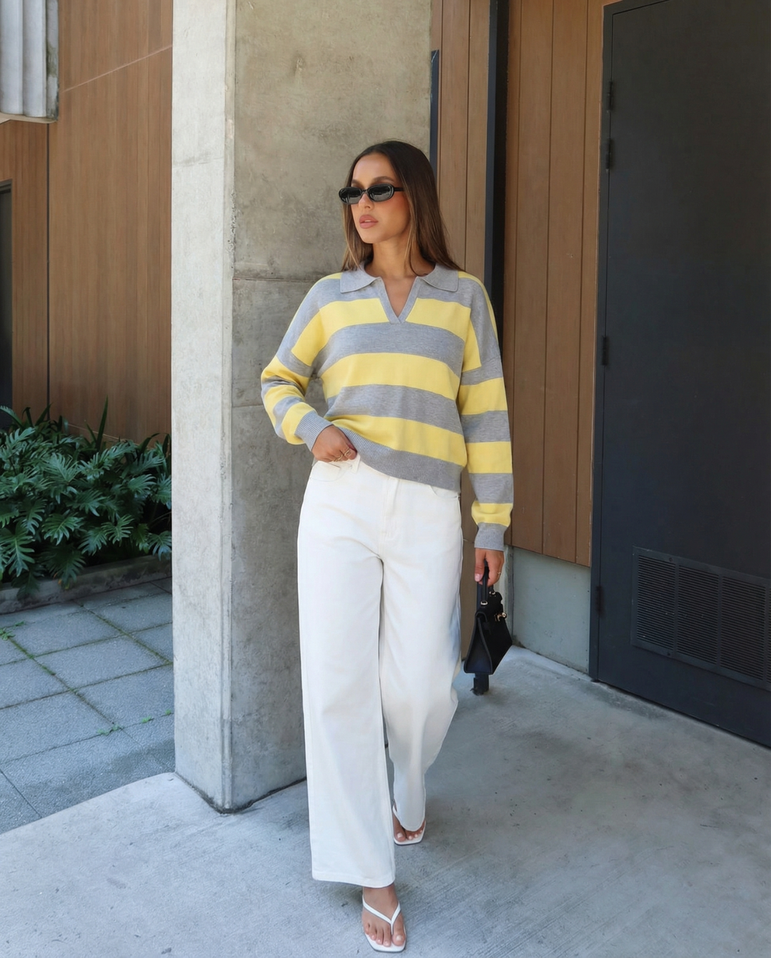Meet the MeandMio Phoebe | Cosy Striped Knit V-Neck Polo Jumper.