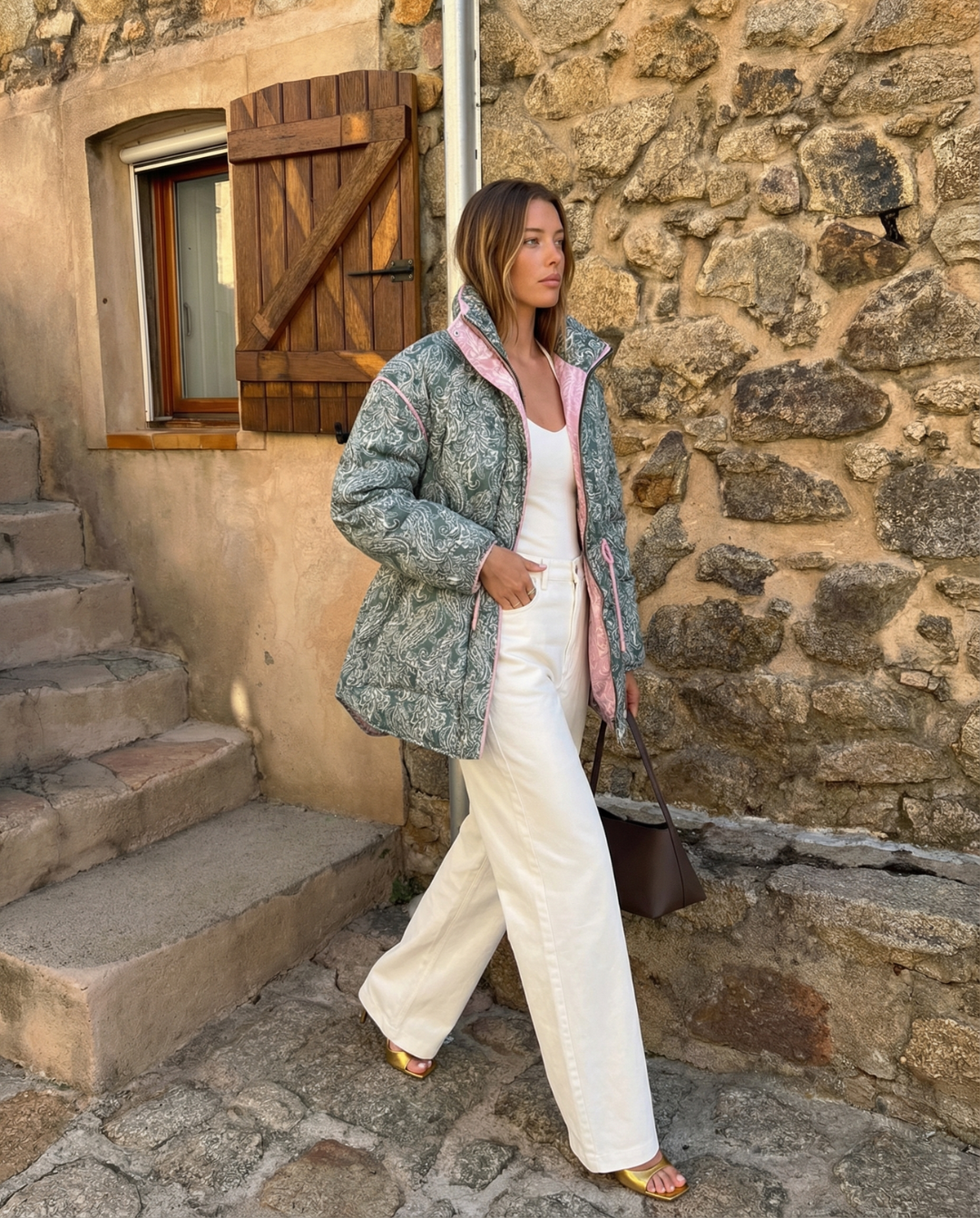 Rhea | Quilted Puffer Jacket Green Paisley Print Oversized Drawstring