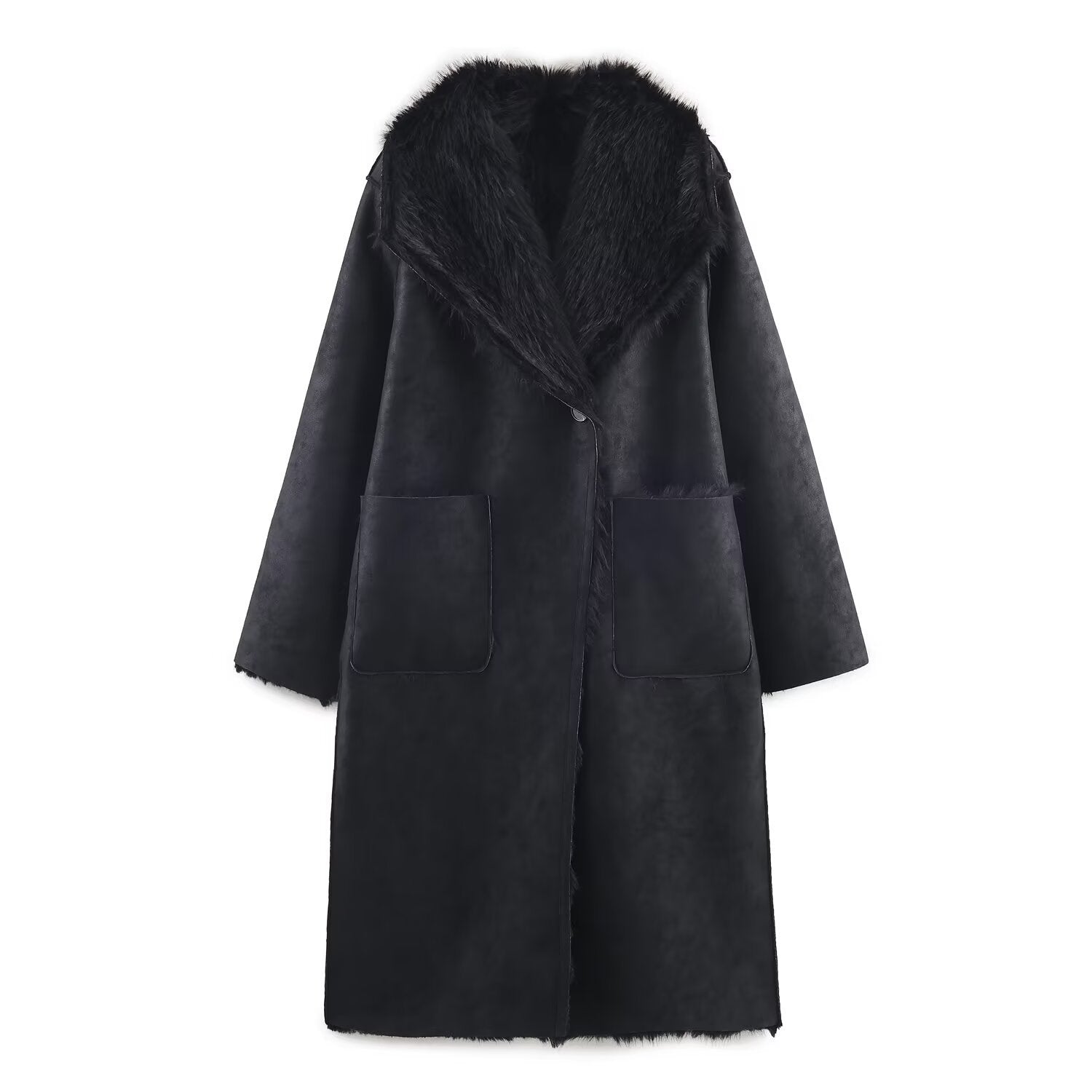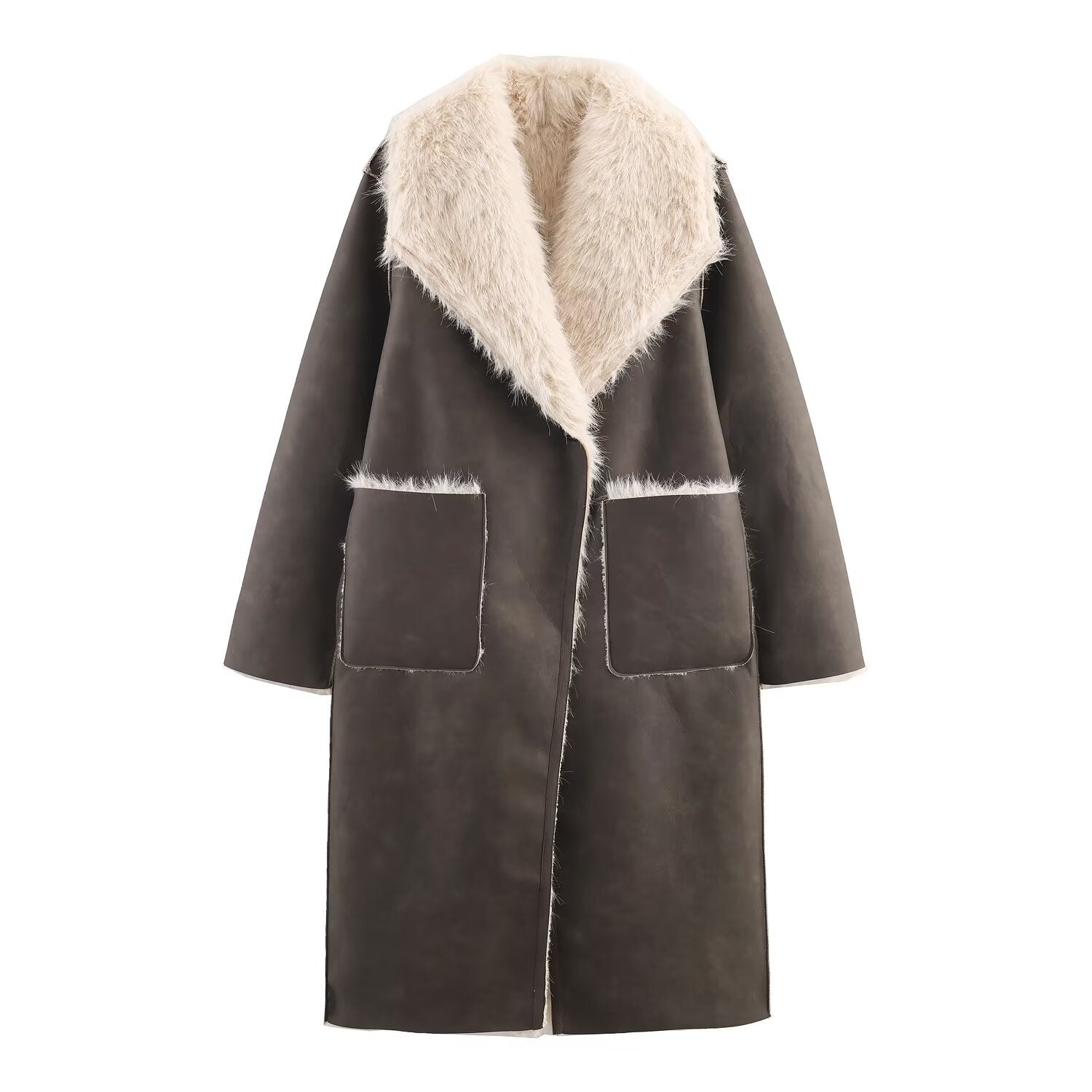 Until now. Meet the Luxe Contrast-Lapel Shearling Coat. A premium quality statement piece that brings warmth, style, and all-day comfort together in one effortless layer.